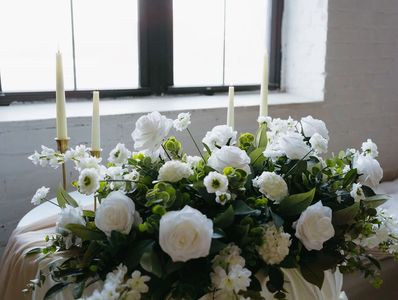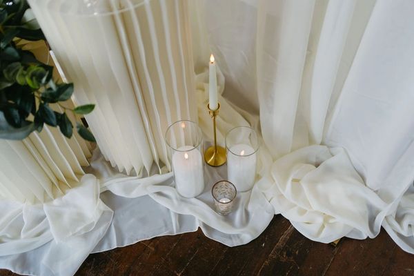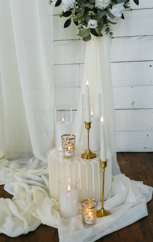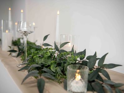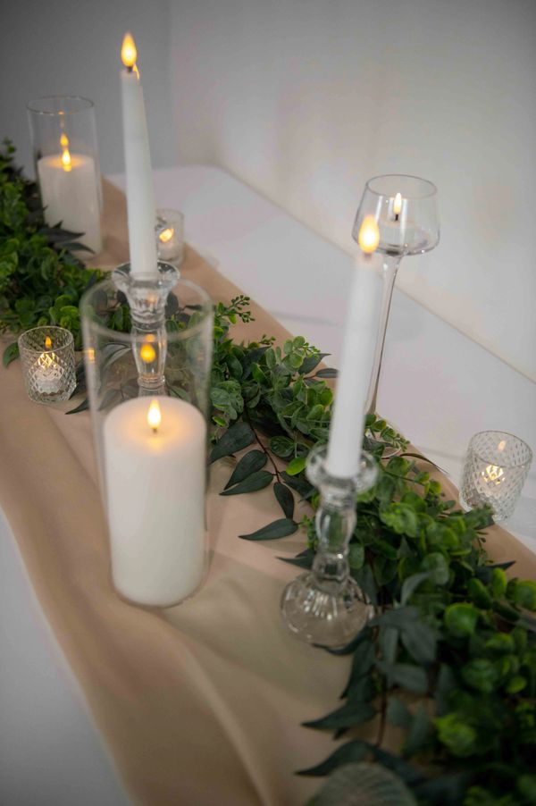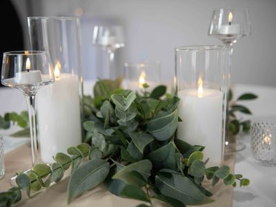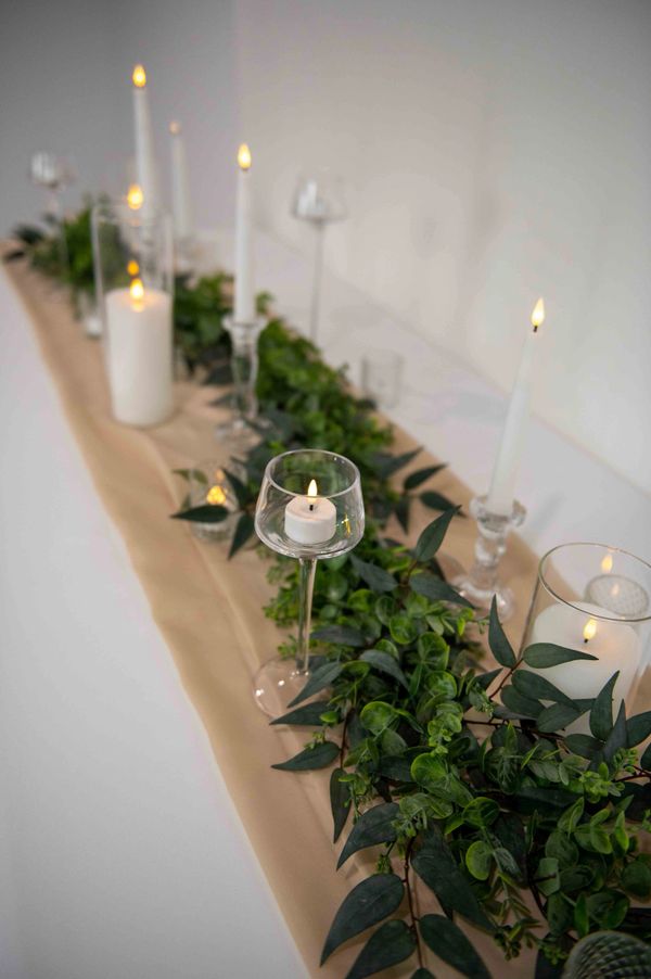 Our most versatile table decor collection. Its simple elegance features a faux eucalyptus and ruscus greenery accompanied by white LED candles in various heights and styles, all in glass candle holders to showcase a romantic glow across each table.